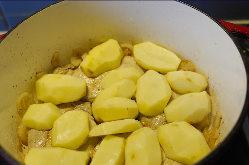 Add the potatoes, peeled and cut in halves (or more, it depends on the size of the potatoes) on top of it: