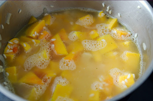 Let it brown for a minute or two, and it’s time to add the stock. Usually, I keep approximately half a liter of stock on the heat; I add boiling stock to cover the rice and the butternut. Add salt if necessary, depending on the stock.
