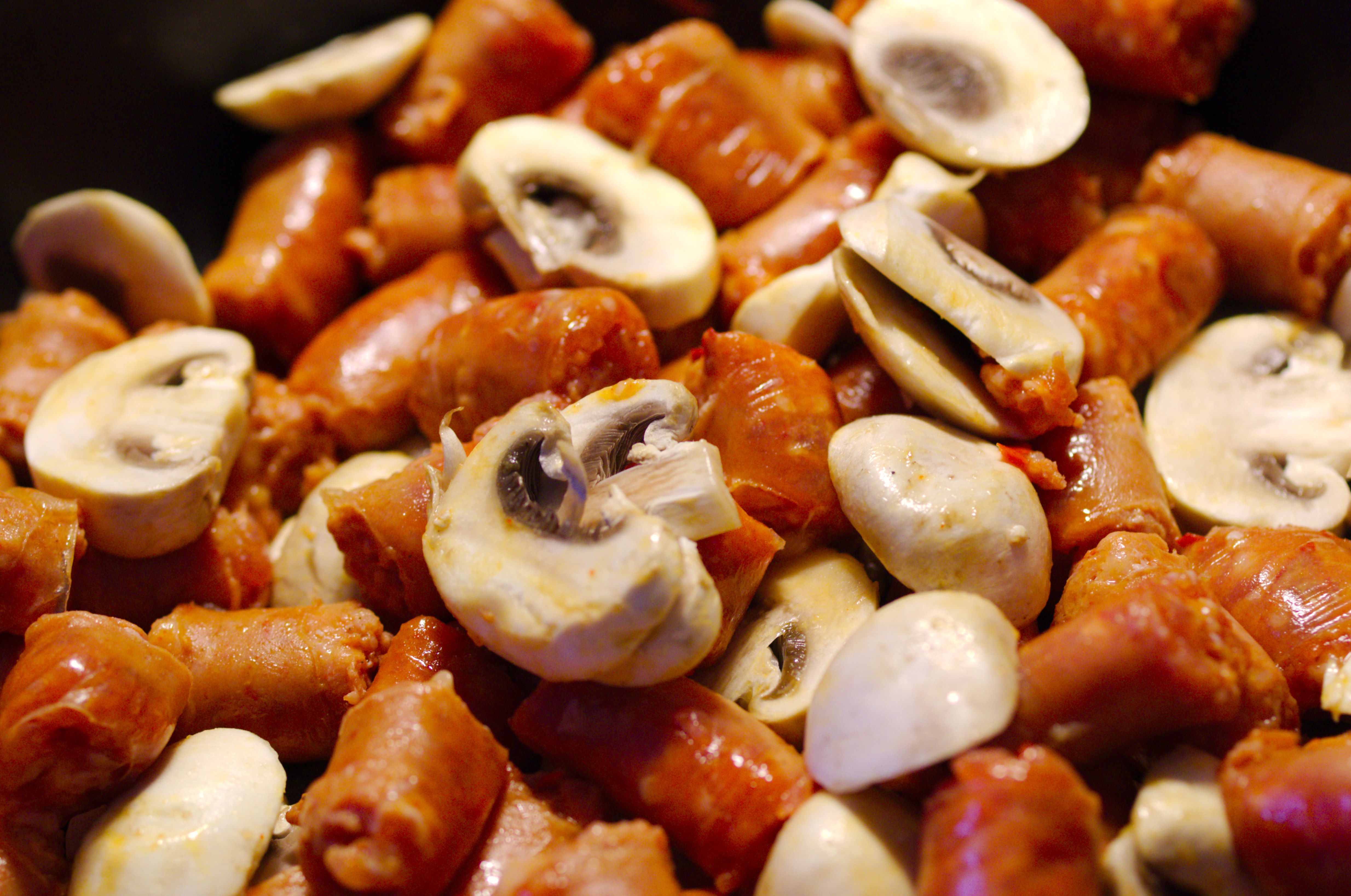 Pendant que ça bout, on fait aussi cuire la saucisse, pis on met les champis avec, tant qu’à faire.
