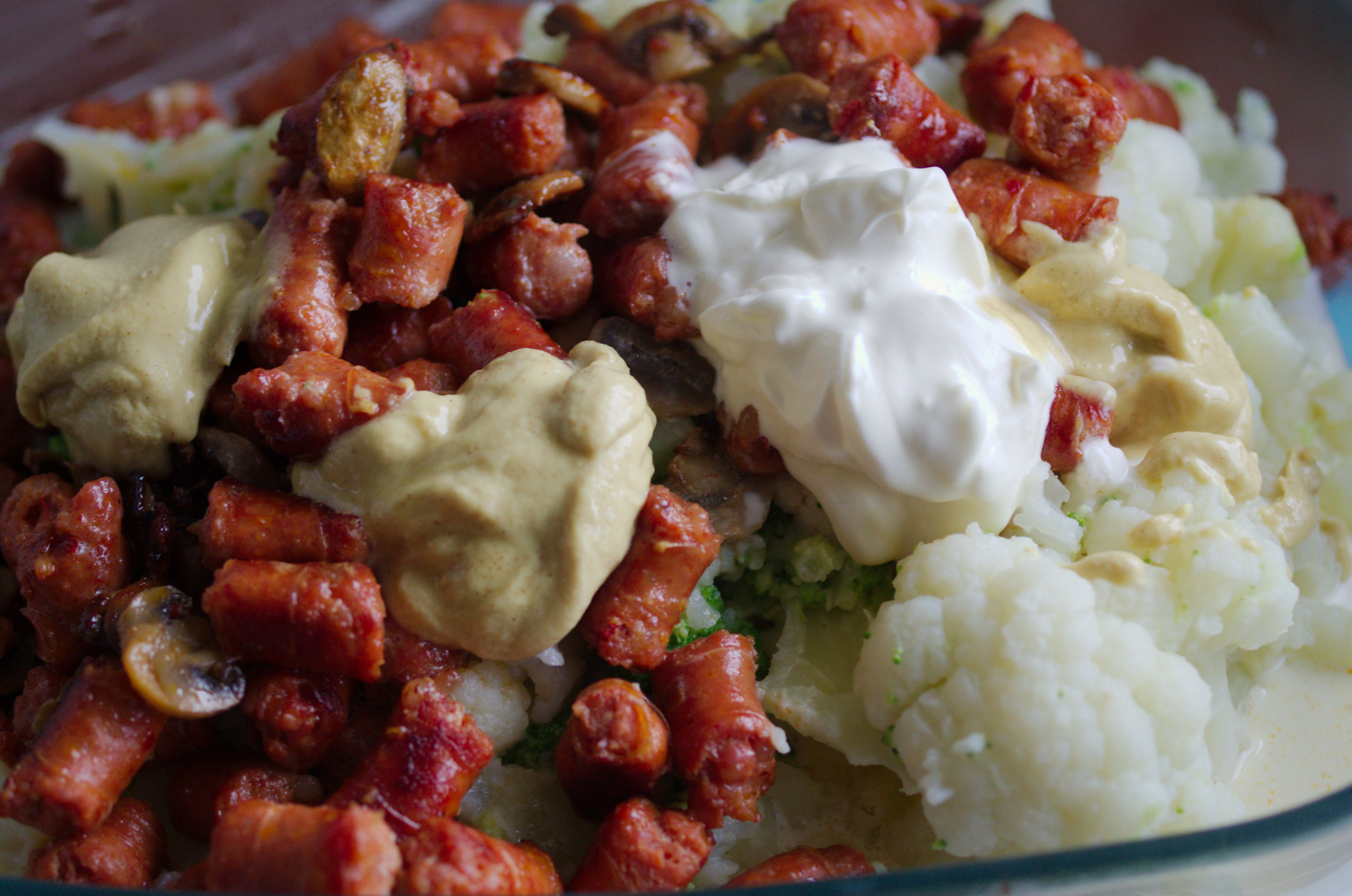 Once everything’s cooked (vegetables, sausage, etc.), pictures tend to degrade fast. Because after you put everything in an oven dish (aforementioned elements, cream, and mustard), you need to stir everything together. Good thing you can put some cheese on top to make it look better.