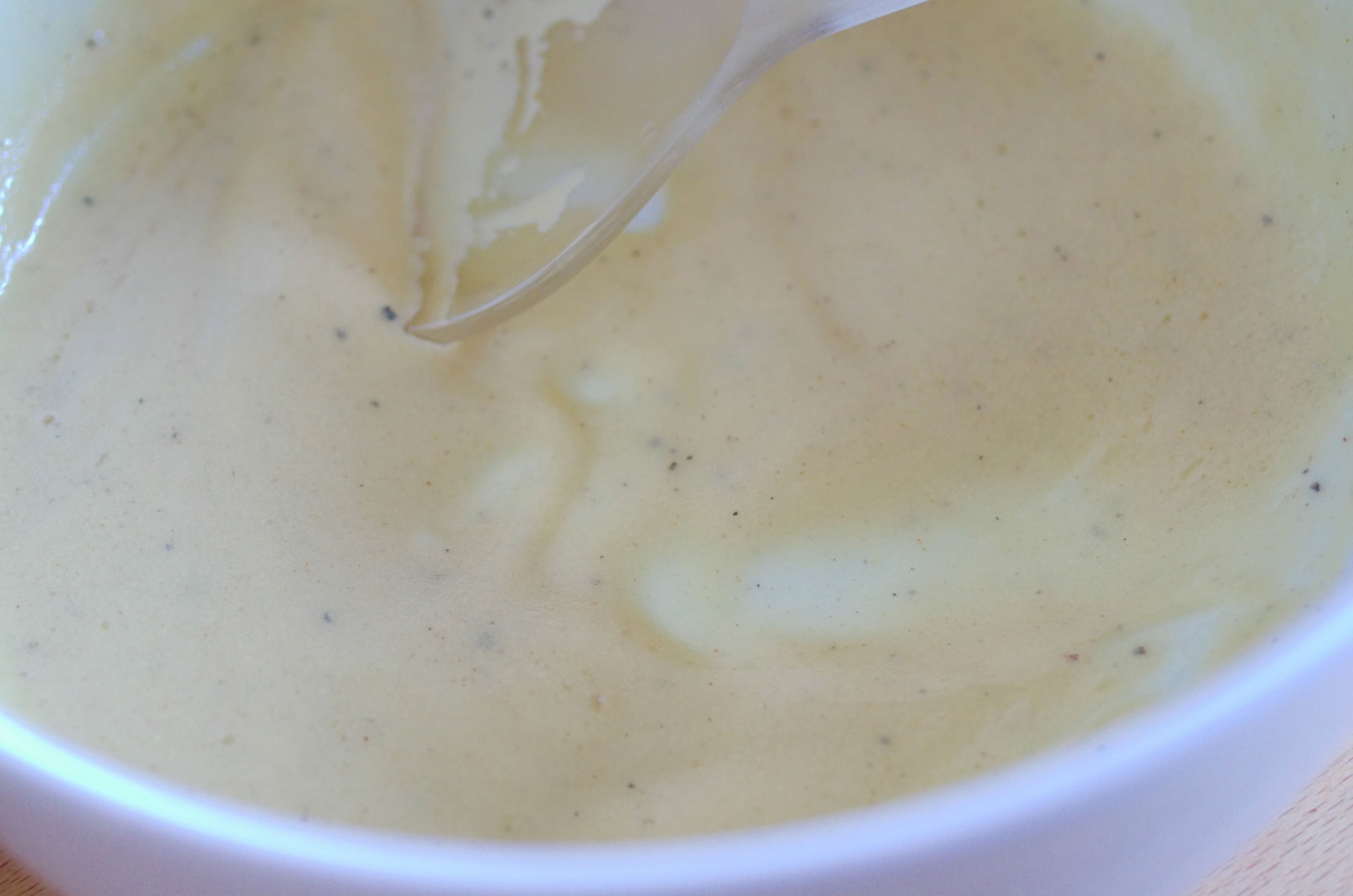 Le lendemain, tout ce qu’il y a à faire, c’est de la vinaigrette. Une grosse cuillère de moutarde, une cuillère de vinaigre (j’ai du vinaigre maison qui décape un peu (mais très bon), fourni par une amie, j’en mets donc plutôt moins que plus). Sel, poivre, on mélange tout ça.