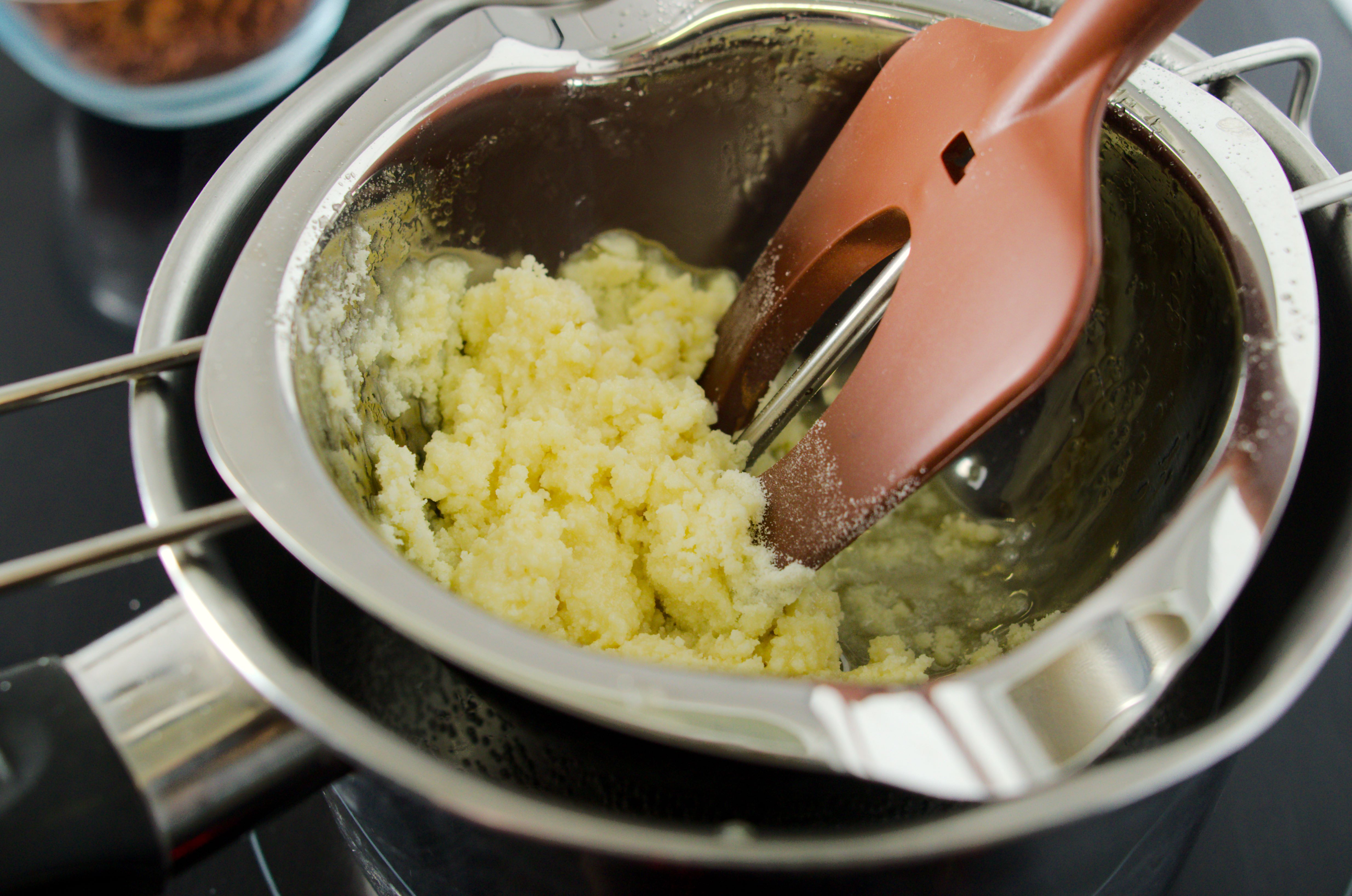 Slowly, we’re in no hurry, and the highest it goes in temperature, the longer it is to cool down. At the beginning, it’s pretty lumpy, but it ends up melting completely and looking like melted butter. This means it’s time to add the cocoa.