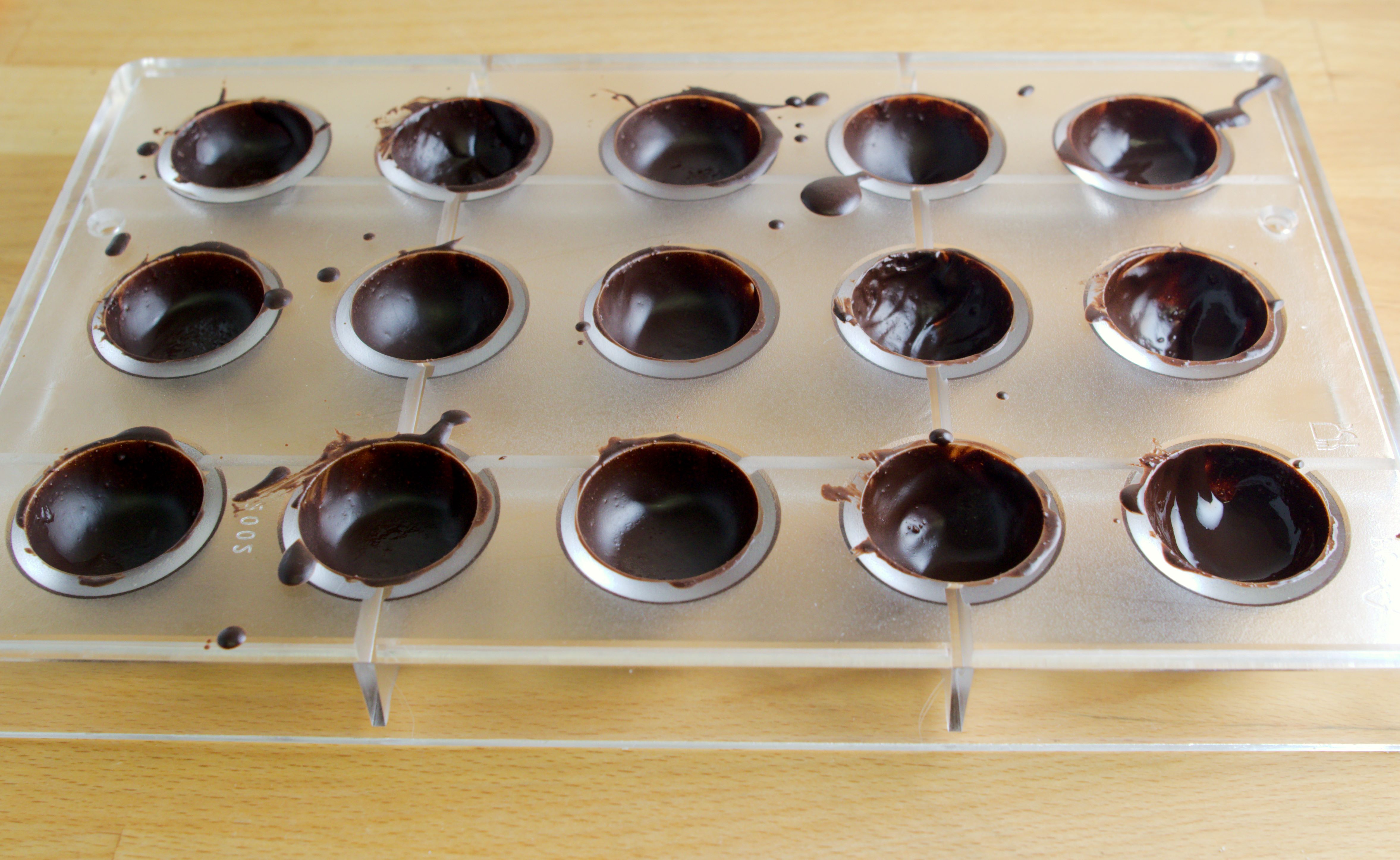 L’avantage du beurre que j’ai fait, c’est que pour une raison mystérieuse, il colle pas aux doigts. Du coup, ça permet d’ajuster facilement dans le chocolat ! Et voilà, toutes les demi-sphères sont remplies.