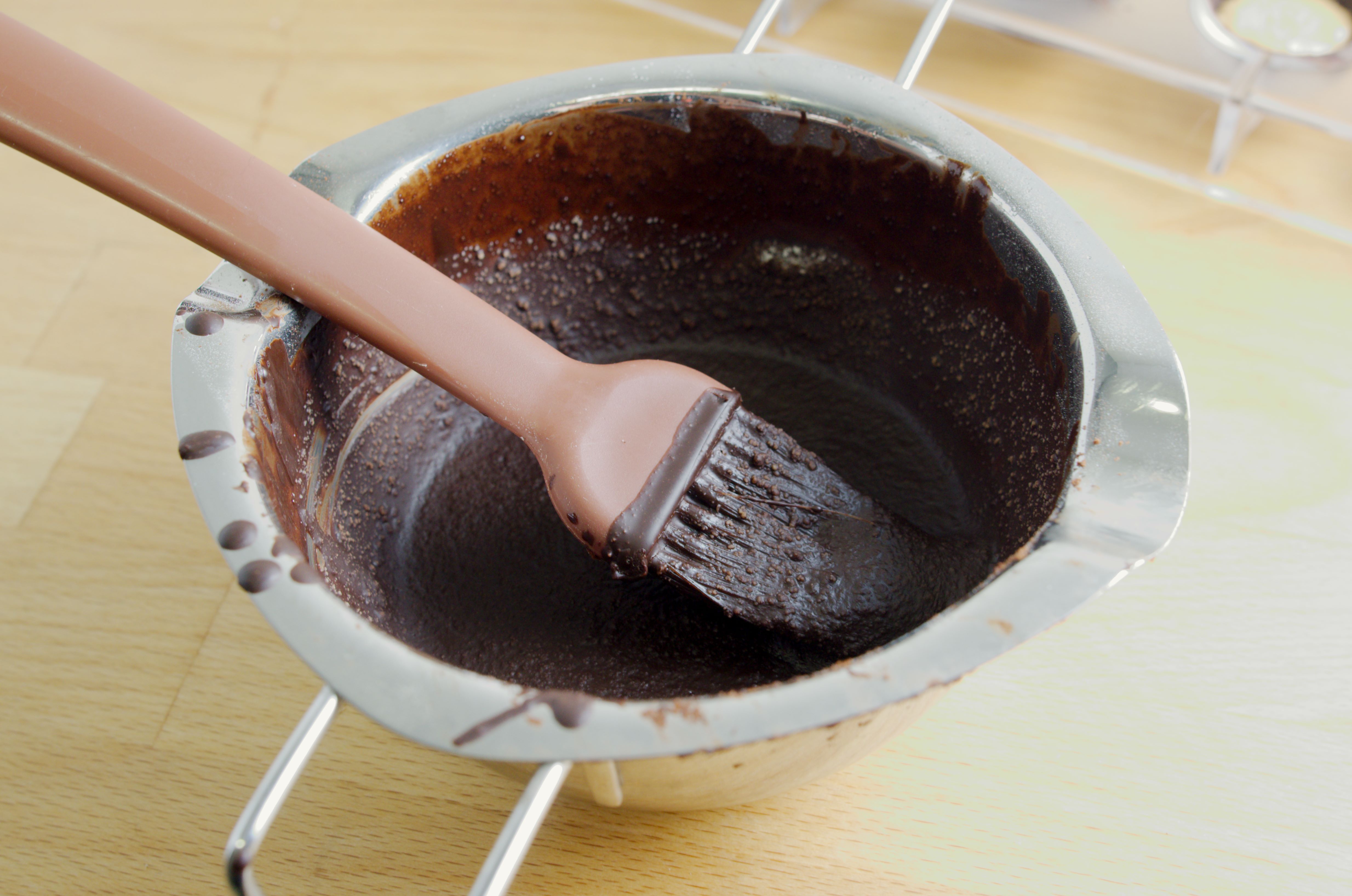 There, that was a few seconds before stirring one last time and adding the Mycryo. Once the Mycryo is melted, well, you have nice chocolate that’s ready to use… quite rapidly before it cools down too much! Get the mold out, check that it’s clean, remove water drops from the bottom of the double boiler if needed (chocolate and water don’t mix, better to be careful) and start painting the prints of the chocolate mold.