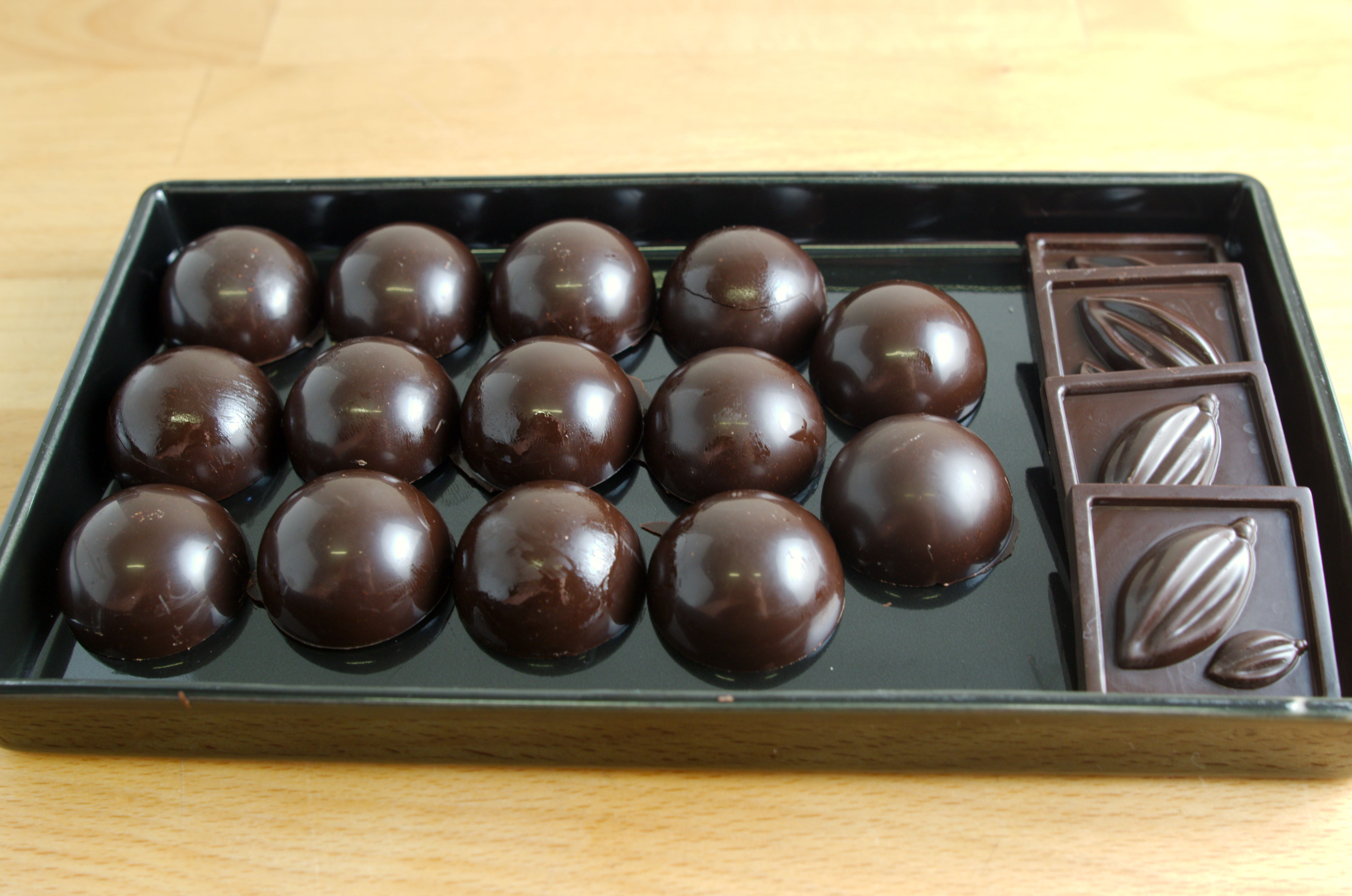 You’d believe the polycarbonate make removing from the mold very hard: after all, it’s rigid plastic. It so happens that correctly tempered chocolate shrinks a bit when cooling down and chocolate… just drops from the mold (it’s a better idea to put the plate on the mold and turn it down than to just turn the mold upside down if you want to avoid breaking chocolate!). Some of these were a bit harder to get out – for some reason (maybe I didn’t wait enough?) the chocolate was more damp and it was adhering. But since these are round, it’s enough to push a bit on a side, and it just pops out.