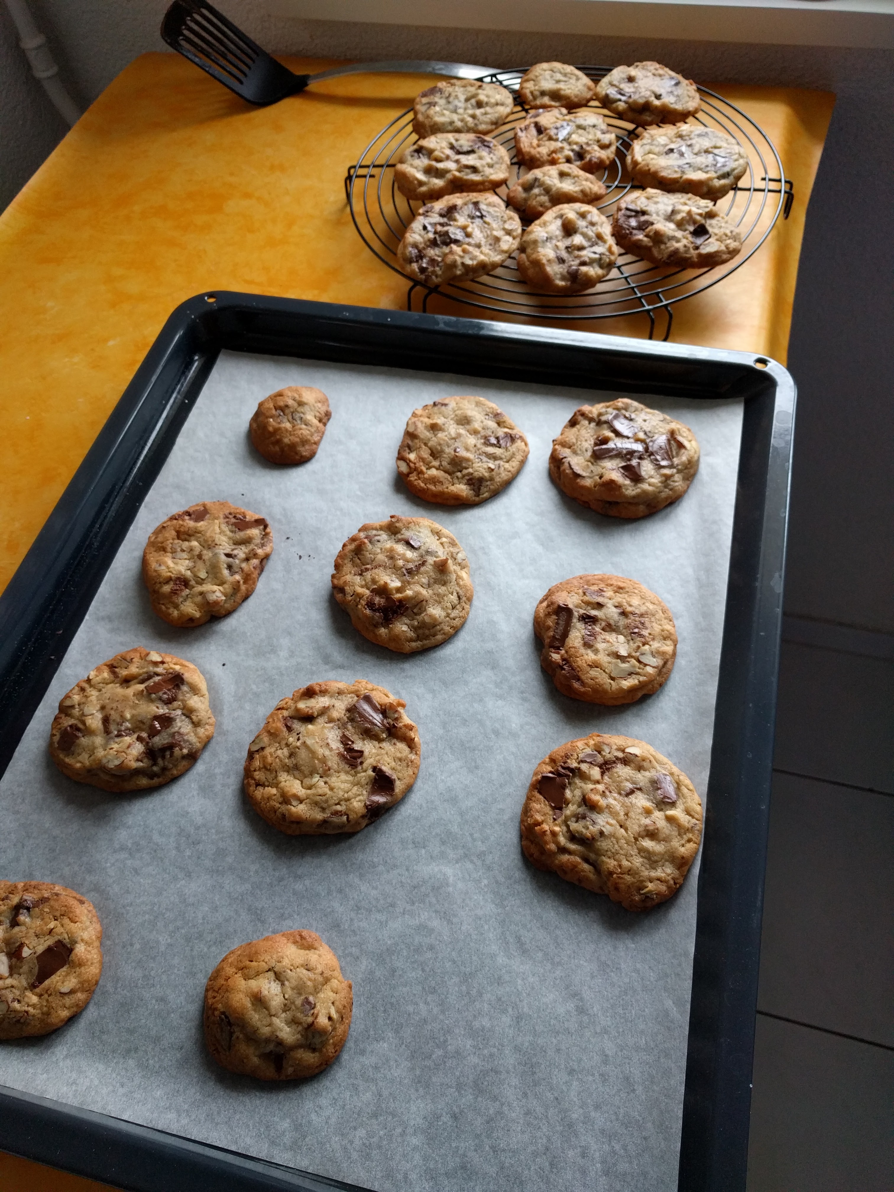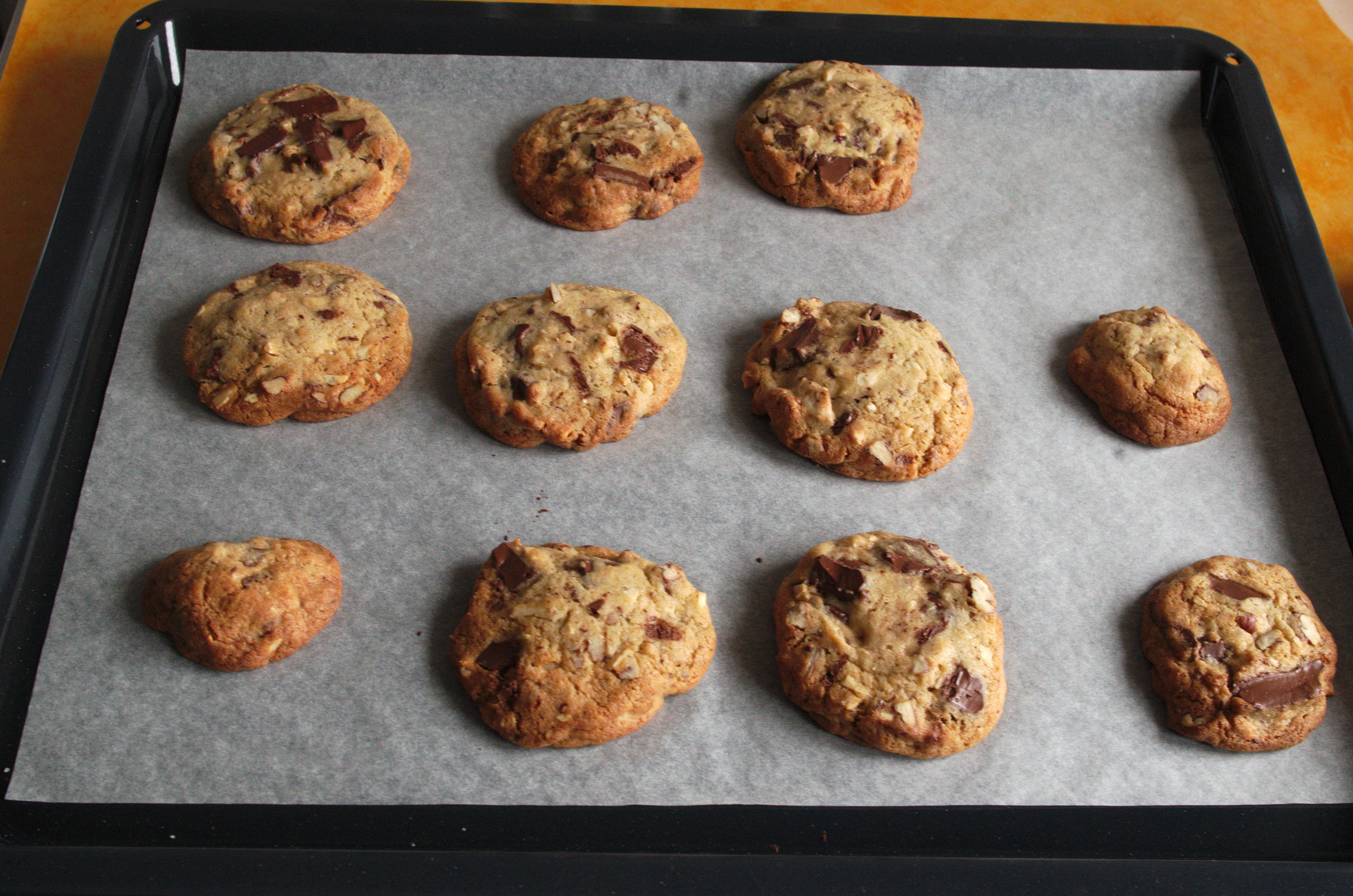 The other day, I was invited at a friend’s place, and I said « I’m bringing some cookies! » Truth be told, I had everything I needed due to a previous cookie-making attempt that hadn’t happened. I had decided for the Chocolate Chip Cookies in Ready for Dessert from Lebovitz, a book that never failed me, and, so I made cookies.