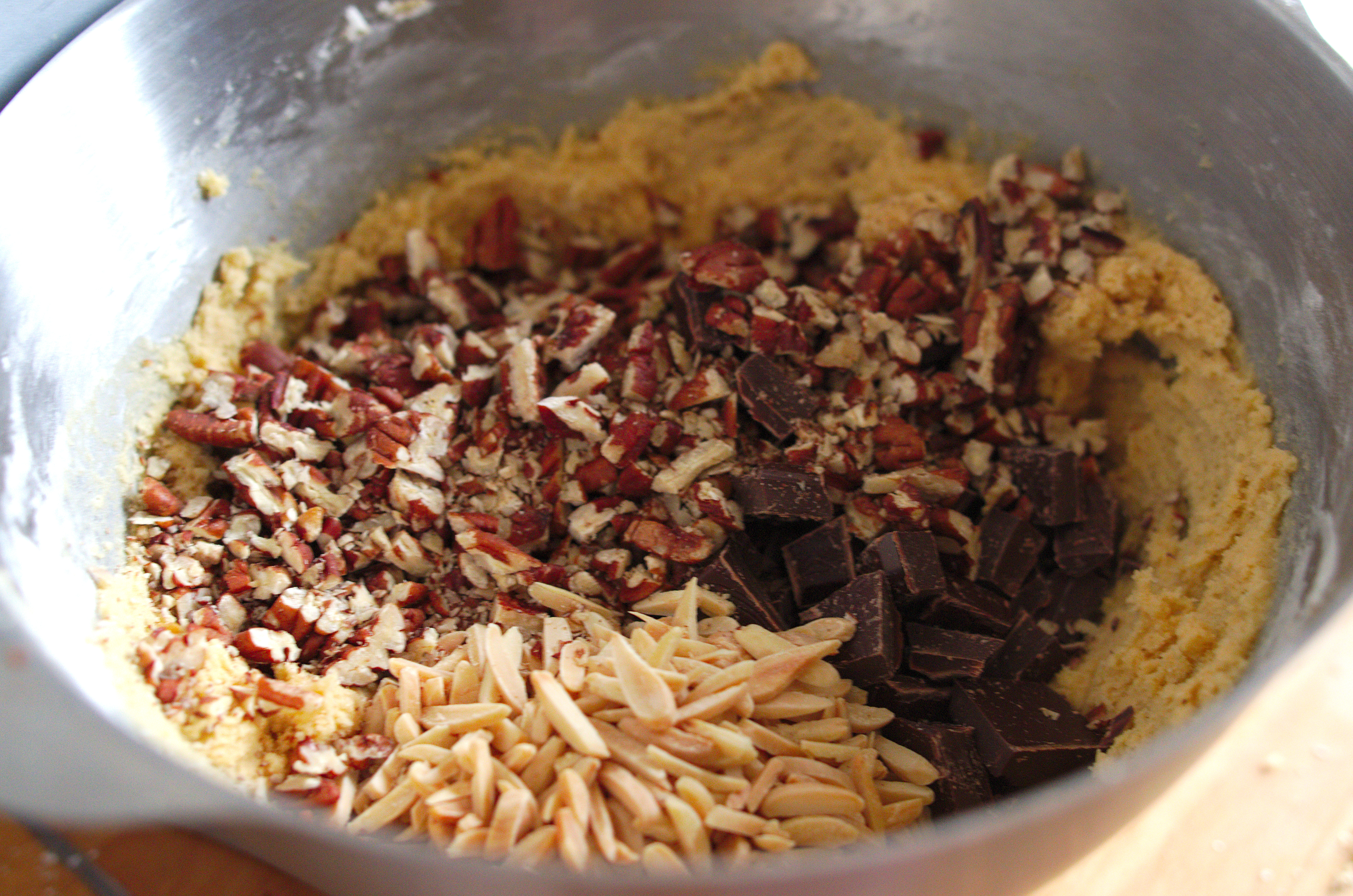 Add the chocolate and nuts. Wonder if there may be slightly too much for the quantity of cookie dough.